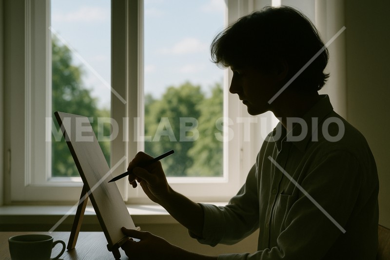 自宅の窓際でアートを楽しんでいる人。逆光でシルエットのように見える。