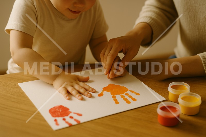 子どもの手形アートを作成している手元。子どもの小さなてのひらがスタンプのようになっている様子。