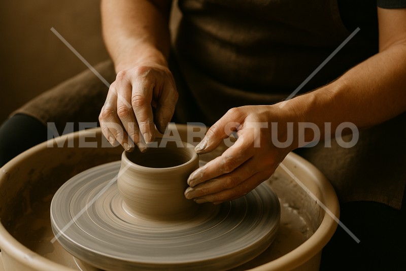 陶芸でろくろを回している人の手元。オリジナルのうつわを作っている最中。