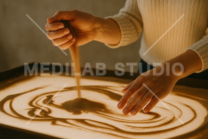 サンドアートをする女性の手元。下から砂がライトに照らされて幻想的な様子。