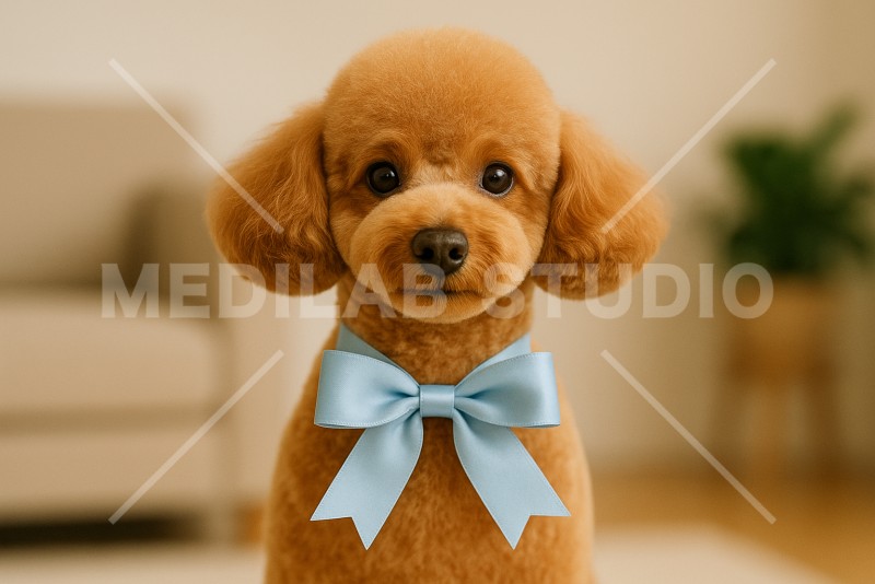 トリミングに行ったトイプードル。かわいいリボンをつけている様子。
