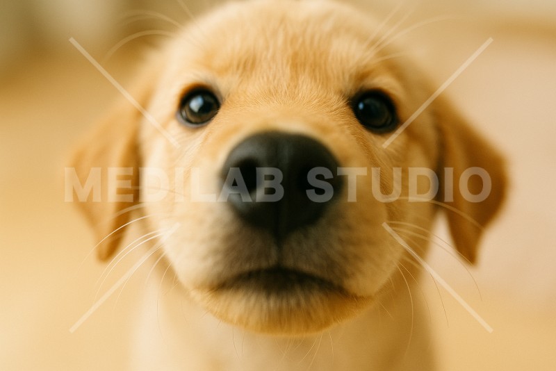 大型犬の子犬。カメラに興味を示していて、鼻がアップになっている。
