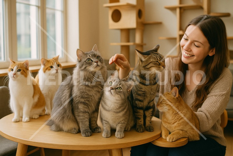 猫カフェでたくさんの猫が一か所に集まる瞬間。さまざまな種類の猫が集まる。