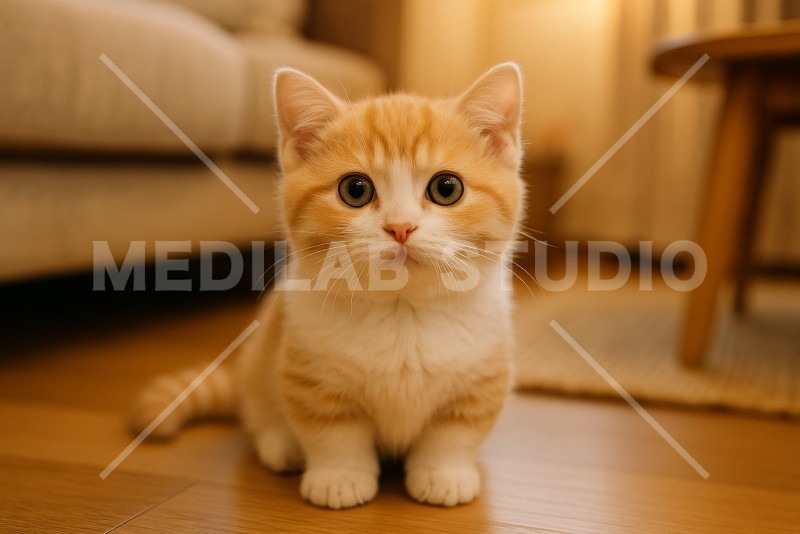 かわいいベージュ色の子猫がきょとんとした表情でカメラを見ている。室内飼育のイメージ。