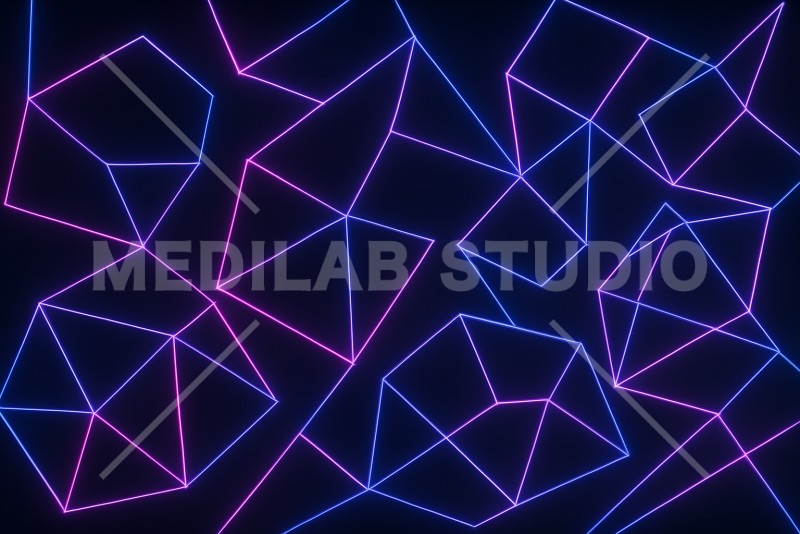 青と紫のネオン線が浮かび上がる幾何学模様。光の軌跡が未来的な世界観を演出。