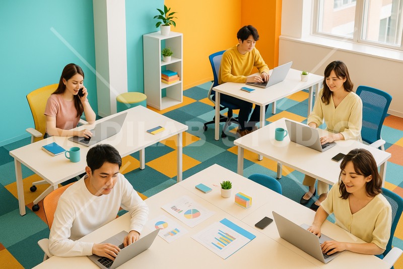 カラフルでおしゃれな雰囲気のオフィス。若い社員たちが仕事中。