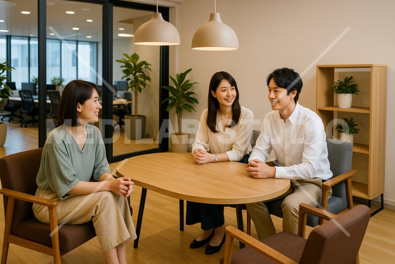 開放的なオフィスのカフェスペース。和やかな雰囲気で社員が会話中。