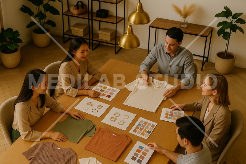 リビングのようなリラックスした雰囲気の会議スペース。社員たちがアイデア会議中。