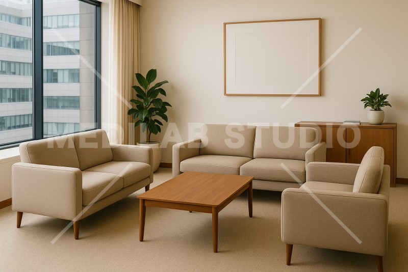 白を基調としたおしゃれな応接室。ソファーや机が配置されている。