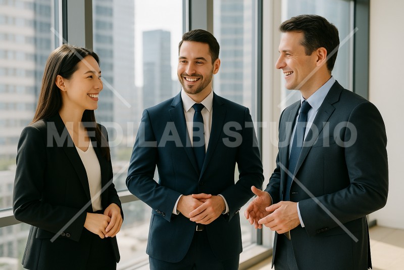 オフィスで立ち話中のビジネスパーソンたち。和やかな印象で笑顔。