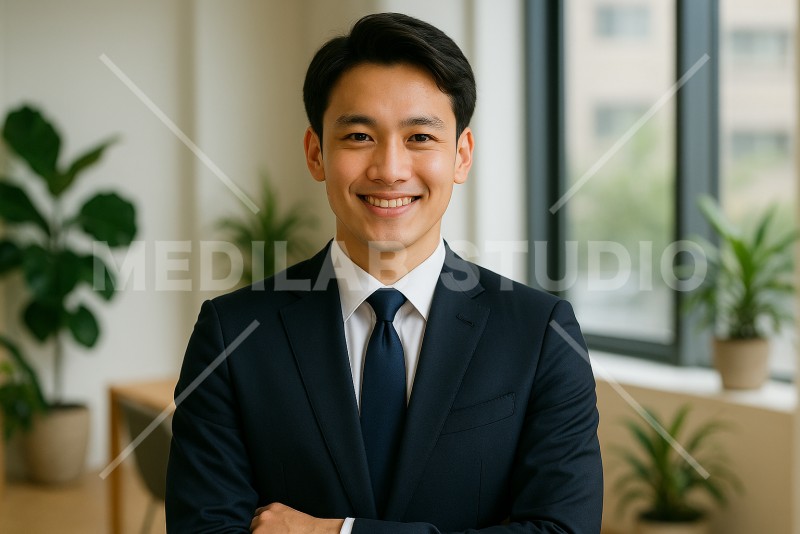 オフィスで微笑む男性の若手ビジネスパーソン。少し緊張した雰囲気。