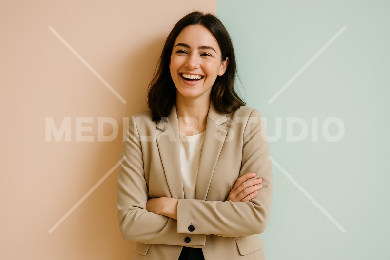 パステルカラーの背景の前で微笑む女性ビジネスパーソン