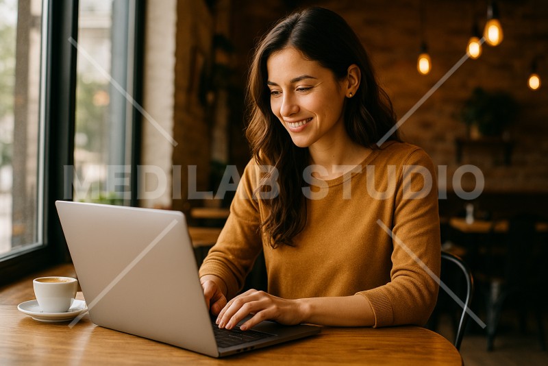 カフェでテレワークする女性。笑顔でリラックスした雰囲気。