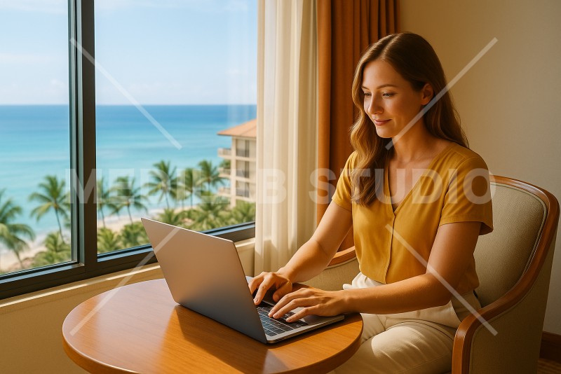 リゾートホテルでワ―ケーション中の女性。明るい窓際でリラックスした雰囲気。