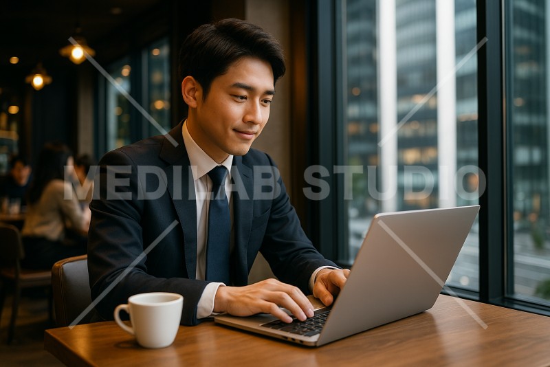 カフェでテレワークをするスーツ姿の若手男性。窓際の席で集中して仕事をしている様子。