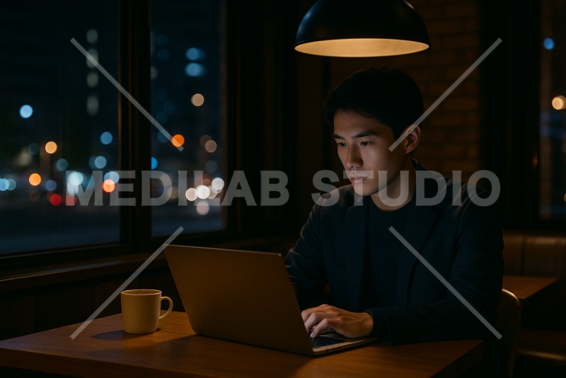 深夜のカフェで作業をする男性。静かな空間で集中する様子。