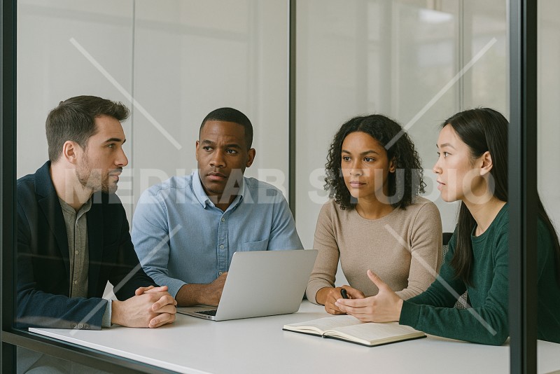 チームで真剣に話し合う様子。ガラス越しに会議室の中を撮影した構図。