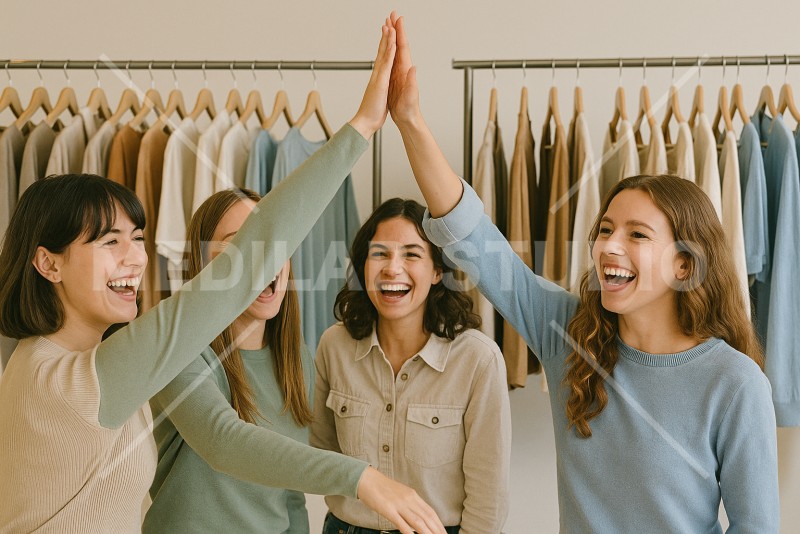 アパレル企業のチームメンバーがハイタッチする様子。明るくチームワークがよいメンバーたち。