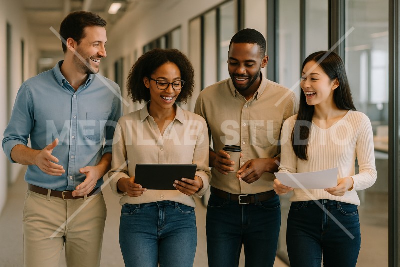 明るいオフィスでチームメンバーが会話しながら歩く様子。和やかな雰囲気。