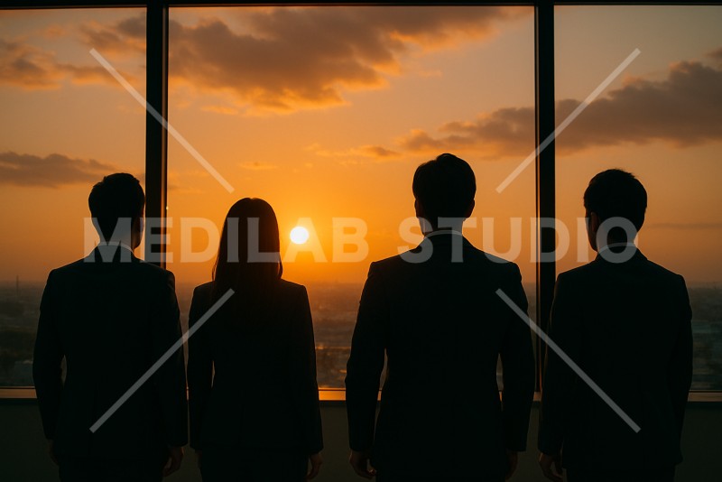 オフィスの大きな窓から夕陽を見つめるチームメンバーたち。同じ方向を向いて努力するチームワークの良さをイメージ。