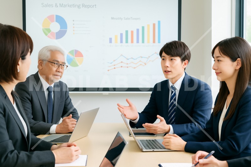 男性の若手社員が会議の場で自分の考えを周囲の人に説明しています。身振りを交えて説明している様子です。