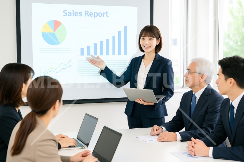 20代女性の社員が会議でプレゼンテーションしています。営業結果の資料を用いて、成績の変化について説明しています。