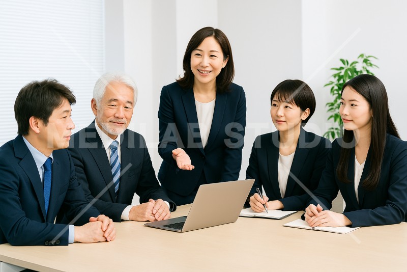 中間管理職の女性社員が小規模部署の会議の中でファシリテーションしています。