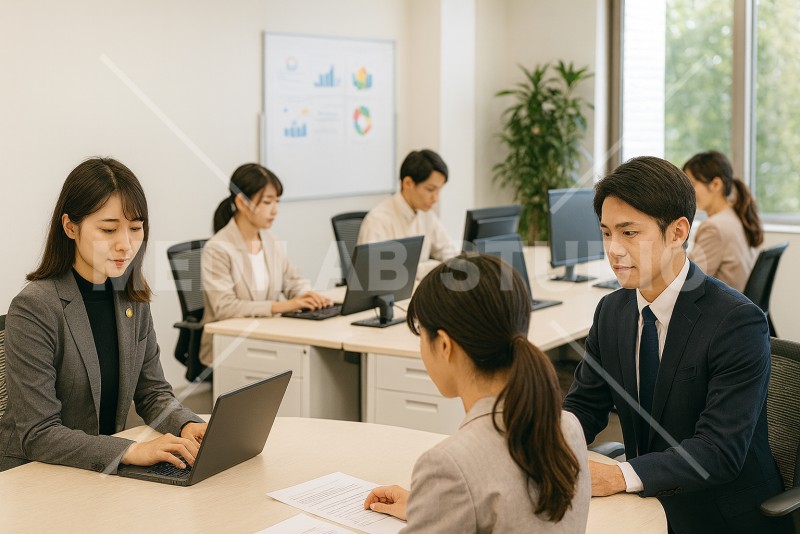シンプルなオフィスで若手社員たちが仕事をしているところ。壁には営業成績表が貼りだされている。