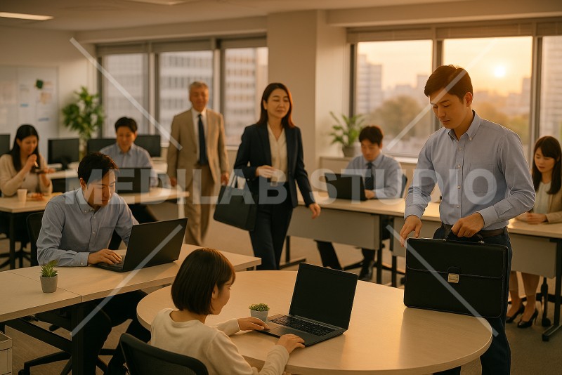 夕方のオフィスで定時になり数名の社員が退社するところ