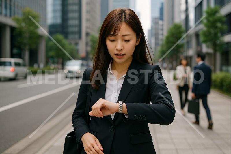 時計を確認しながら、若手女性社員が取引先に向かう様子です。