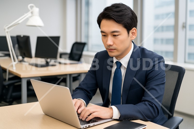 20代の男性ビジネスパーソンがオフィスで仕事をしている様子です。