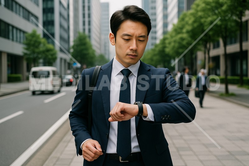 男性ビジネスパーソンが時間を気にしつつ取引先まで歩いて向かっているところです。