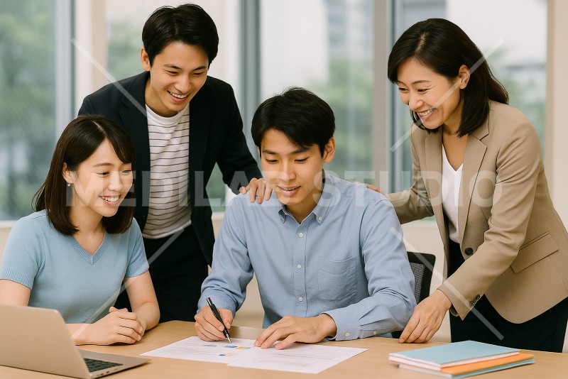 若手社員の仕事を年代が近いメンバーがしっかりサポートしている、チームワークを感じるシーン。