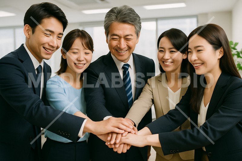 中心にいる上司を中心にメンバーが一丸となって頑張ることを誓う、チームワークを感じるシーン。