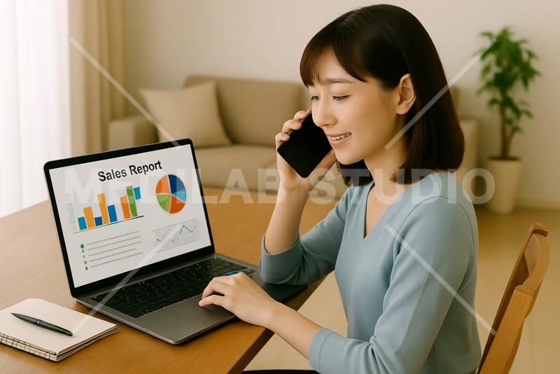 リモート中に電話営業をしている女性社員。PCで資料を投影しながら話している。