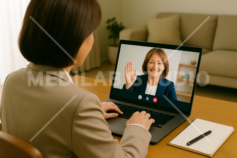 40代の中堅社員が、リモート勤務中にオンラインで海外の取引先とミーティングしている様子。