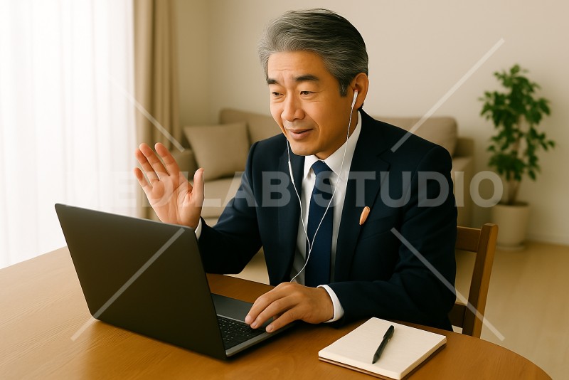 テレワークで、60代の男性上司がオンラインミーティングに参加しているところです。有線イヤホンを着用。