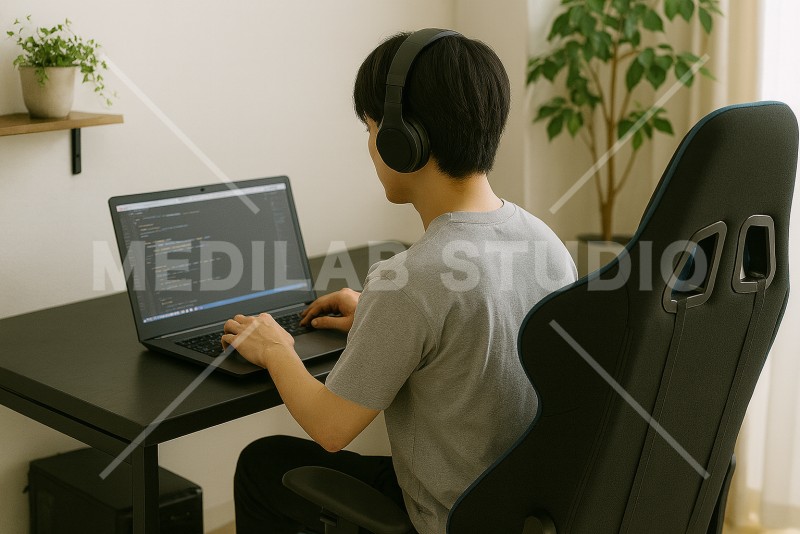 20代若手のエンジニアがテレワークで作業を進めている様子。ヘッドホンを着用しゲーミングチェアを使用。