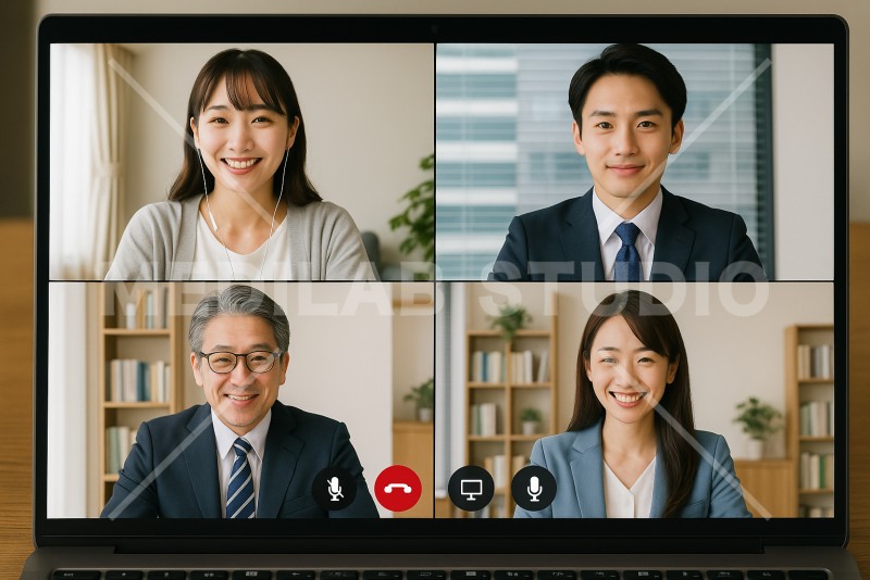 リモート勤務中にオンライン会議を開催し、4名のメンバーが集まっている様子。