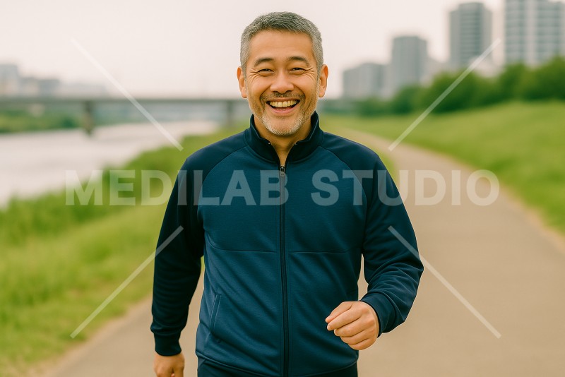 50代くらいの男性がスポーティーな服装で、河川敷でジョギングをしている様子です。笑顔です。