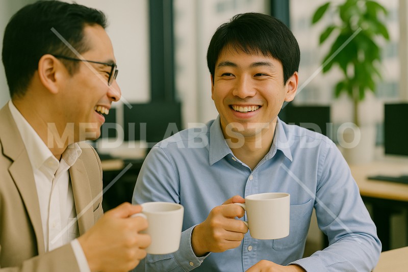 若い男性がカフェでもう1人の男性と談笑している様子です。手にはカップを持っています。
