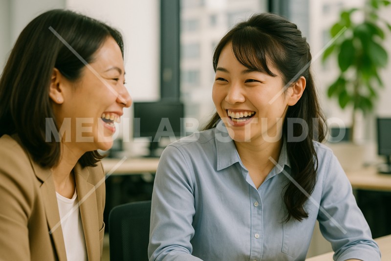 若手会社員の女性がオフィスで同僚と談笑している様子
