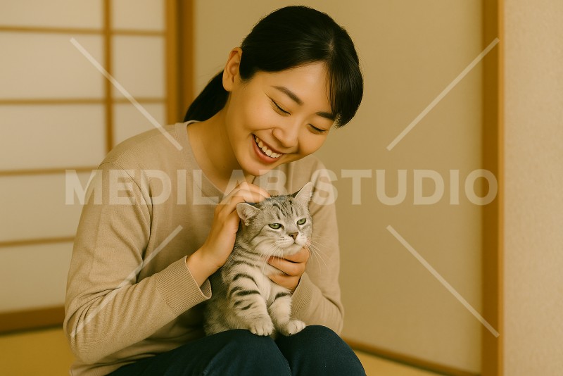 若い女性が和室で愛猫をなでて笑顔を浮かべている様子です。