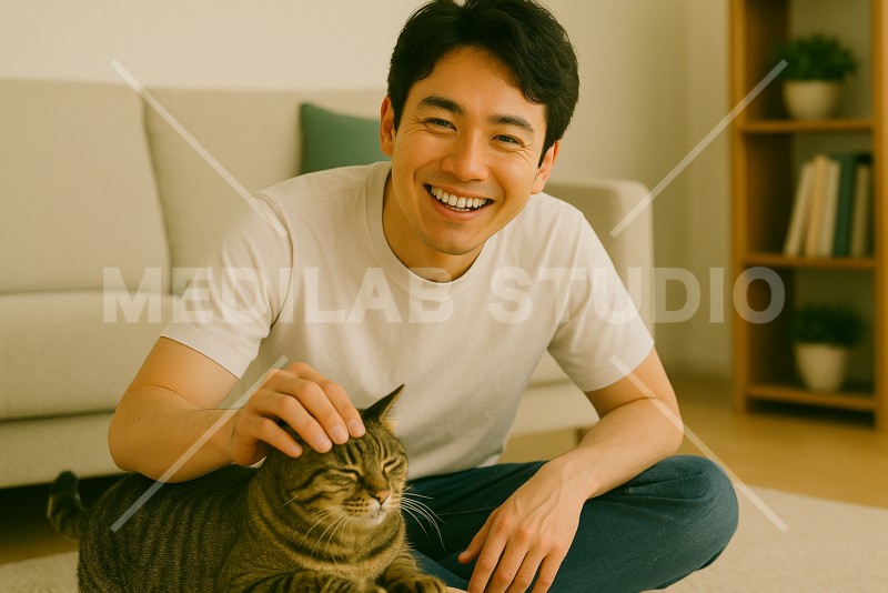 20~30代の男性がリビングで愛猫をなでて笑顔を浮かべているところです。