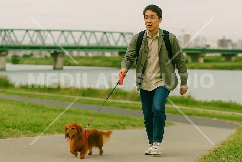男性がペットのミニチュアダックスフンドを連れて河川敷を散歩している様子です。