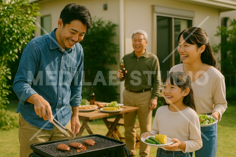 休日の昼間、庭でバーベキューをしている家族