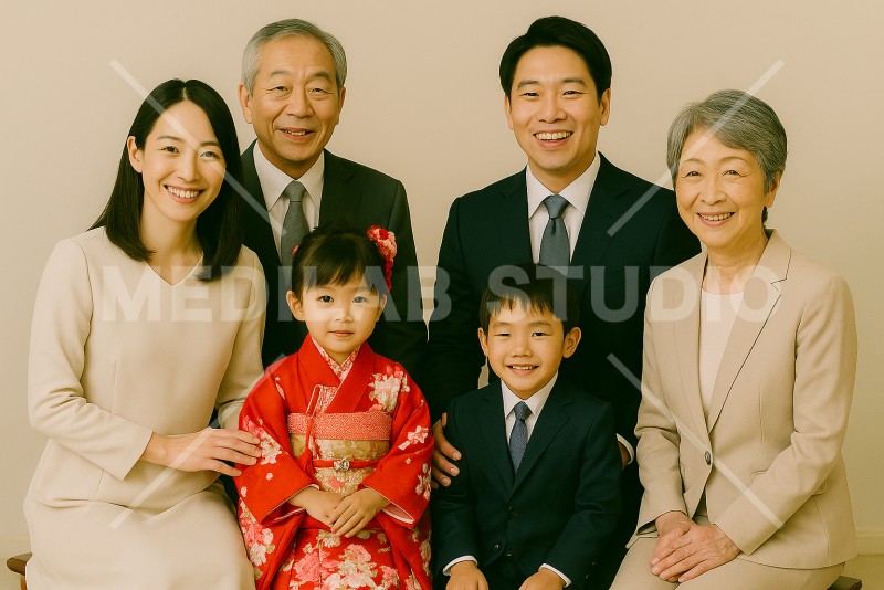 娘の七五三を迎え、家族でお祝いの写真を撮影した様子です。