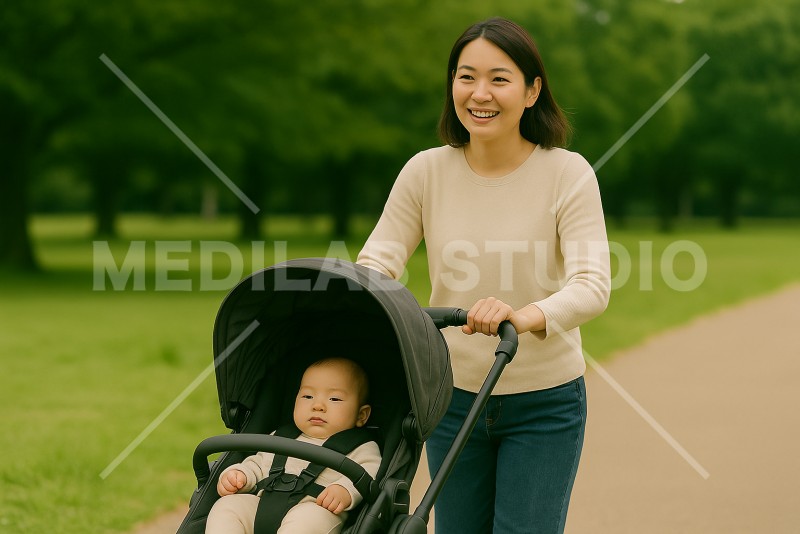 赤ちゃん連れのママがベビーカーを押しながら公園で散歩をしている様子です。
