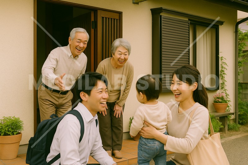 祖父母の家に帰省をした、赤ちゃんがいる夫婦の様子です。笑顔で出迎えられています。