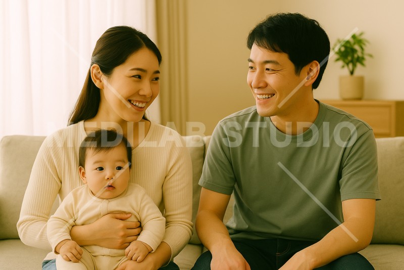 赤ちゃん育児中の夫婦がソファーで笑顔を浮かべてくつろいでいる様子です。